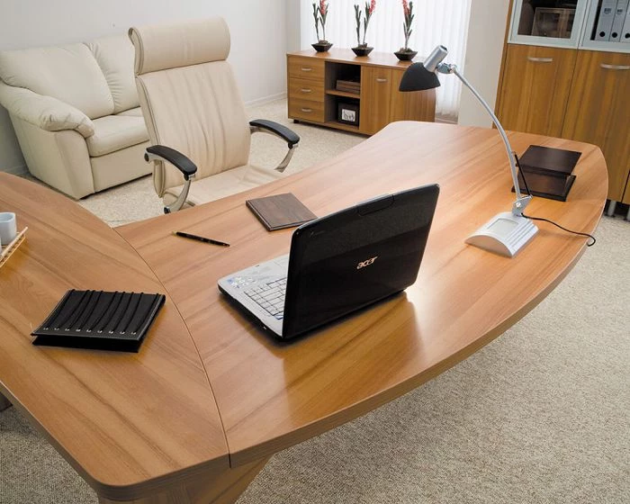 Данный кабинет руководителя доступен в трех цветах. Первый из них – орех. Это стандартный, спокойный и приятный глазу оттенок. К нему можно подобрать светлую обивку и аксессуары, тогда все оформление помещение будет выглядеть по-деловому, но вместе с тем не скучно.
