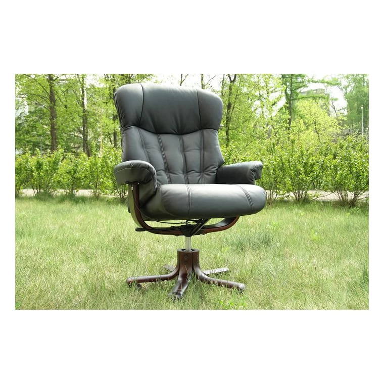 Металлическая надежная база находится на мощной крестовине из гнуто клееного дерева, его тон соответствует цвету подлокотников. Пять лучей заканчиваются пластиковыми прорезиненными роликами, которые не повредят даже паркет.