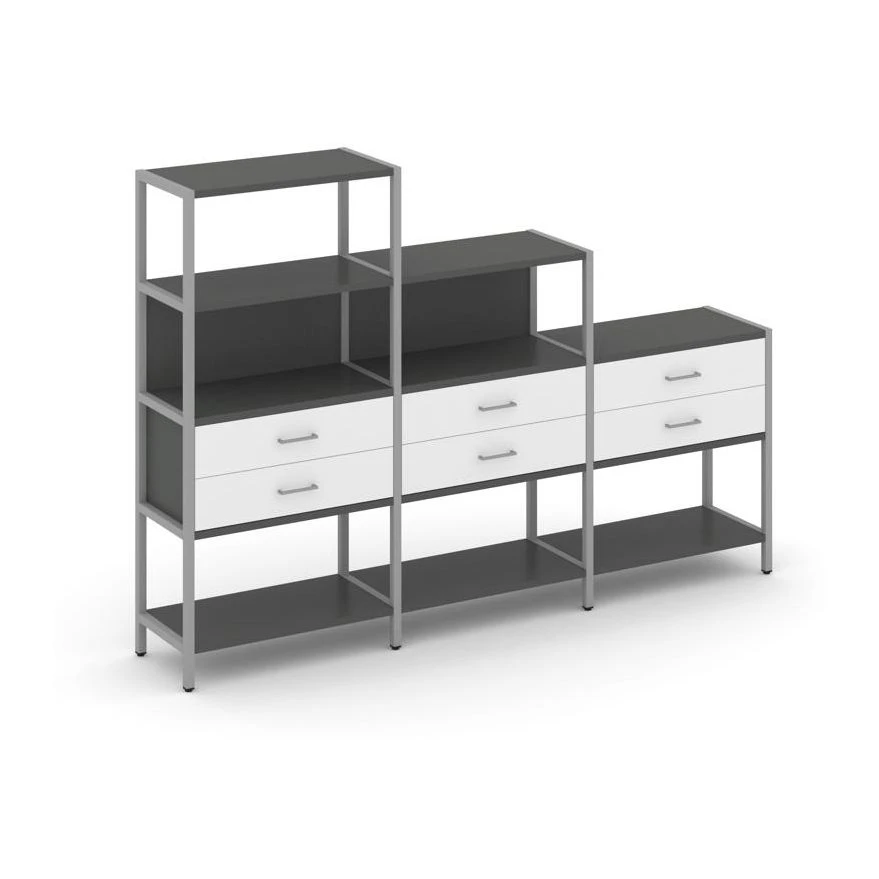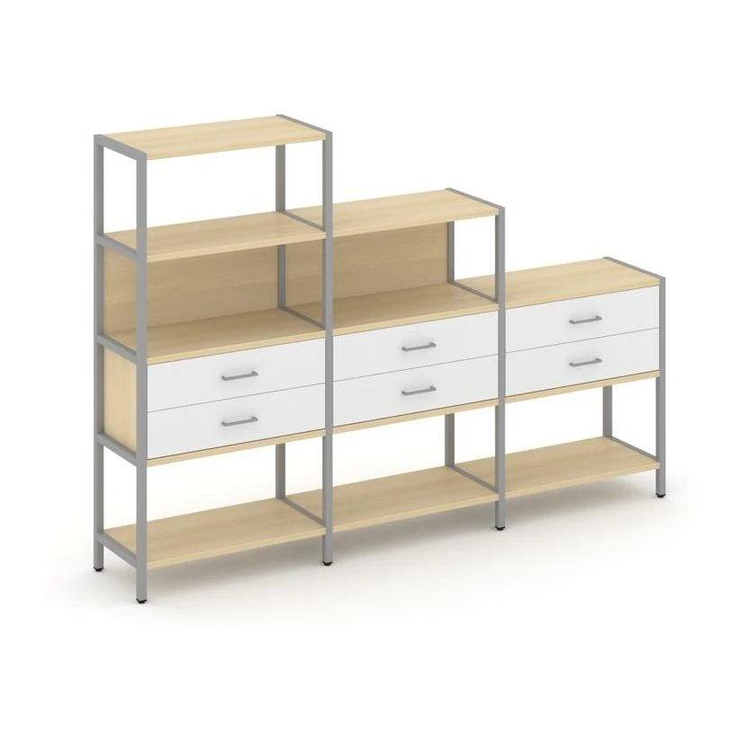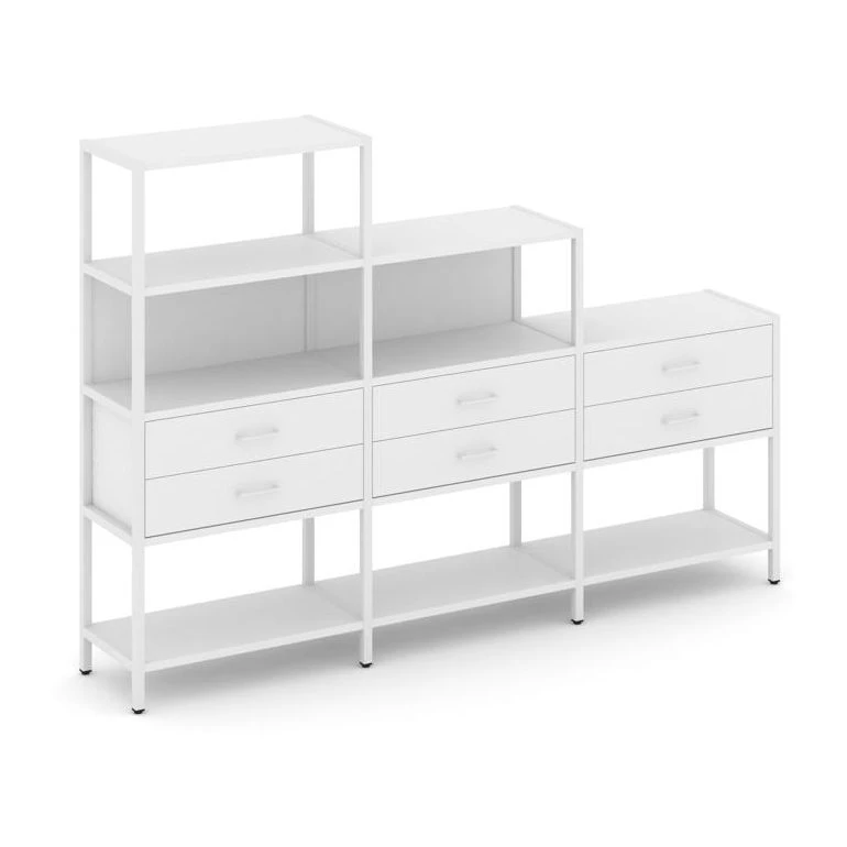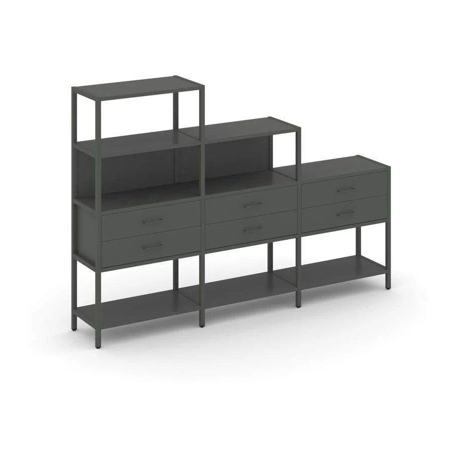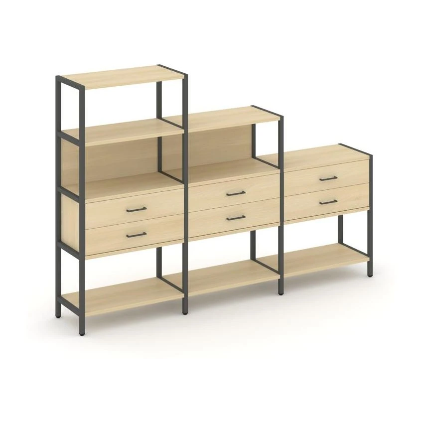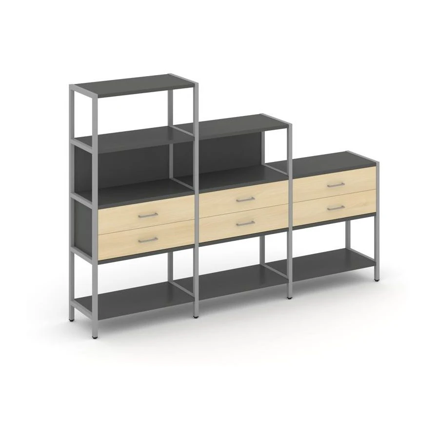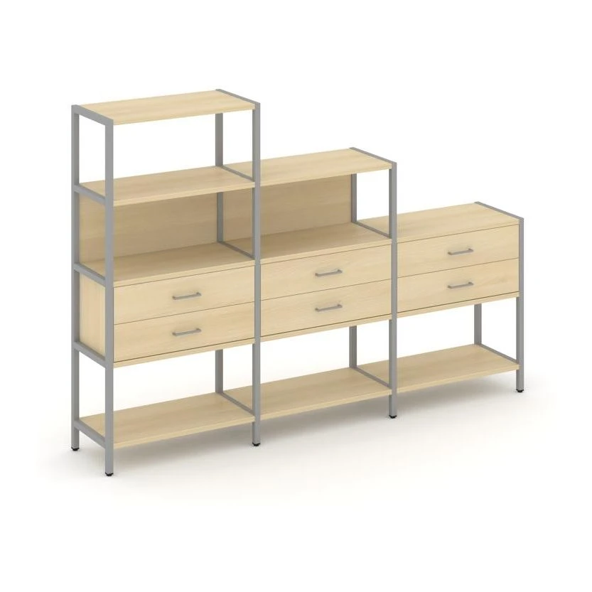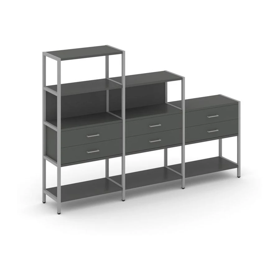 - Трехсекционный стеллаж четырех/трех/двухярусный с ящиками 2730х400х1613 Шелф Систем / Shelf System