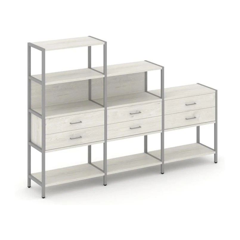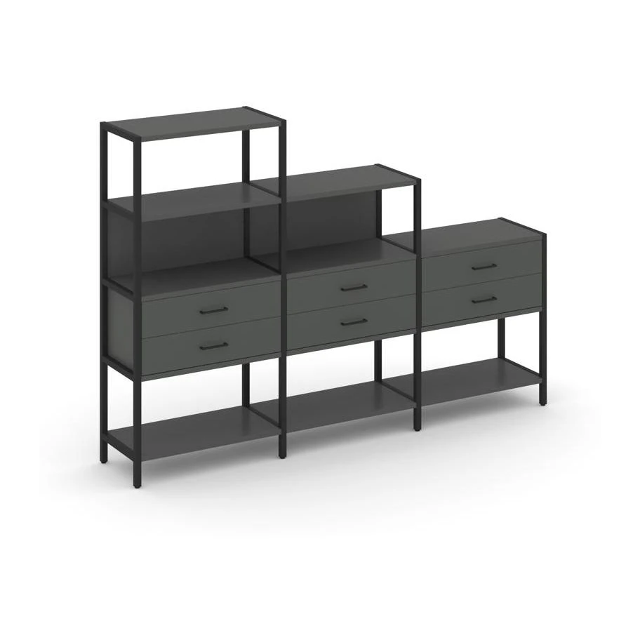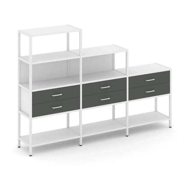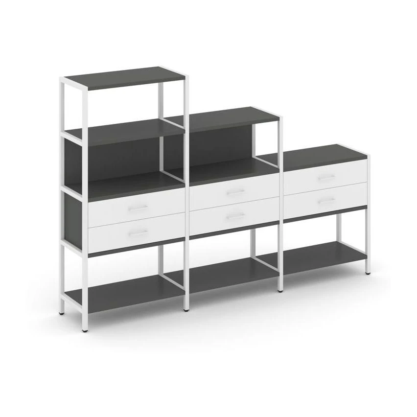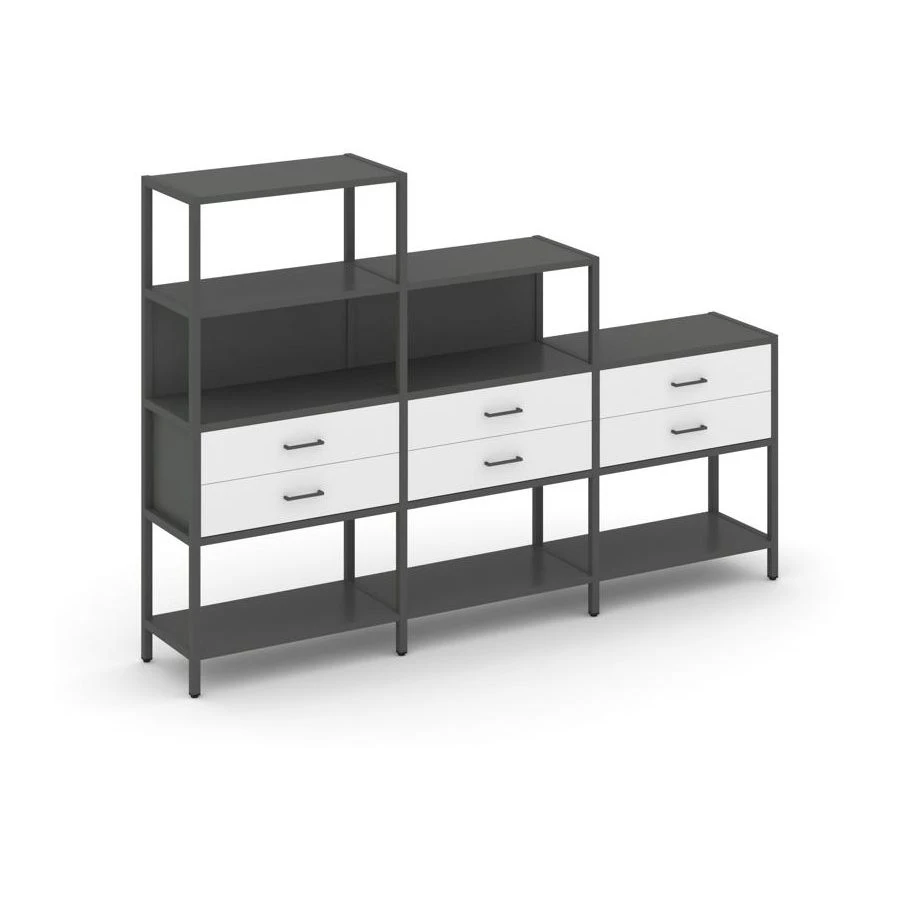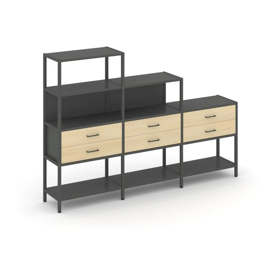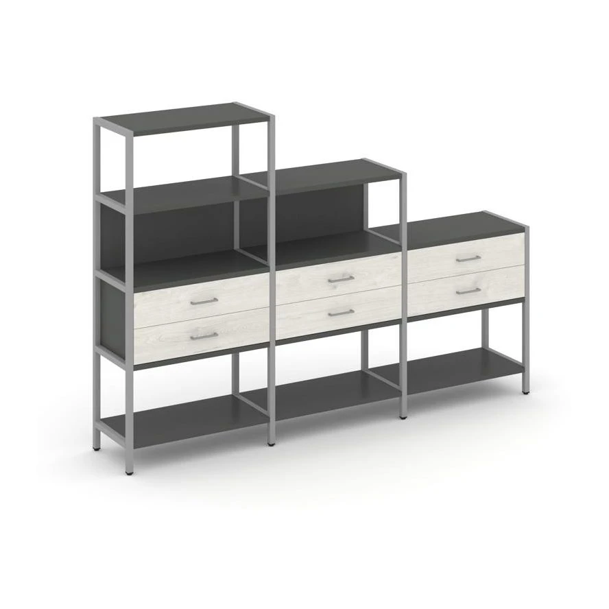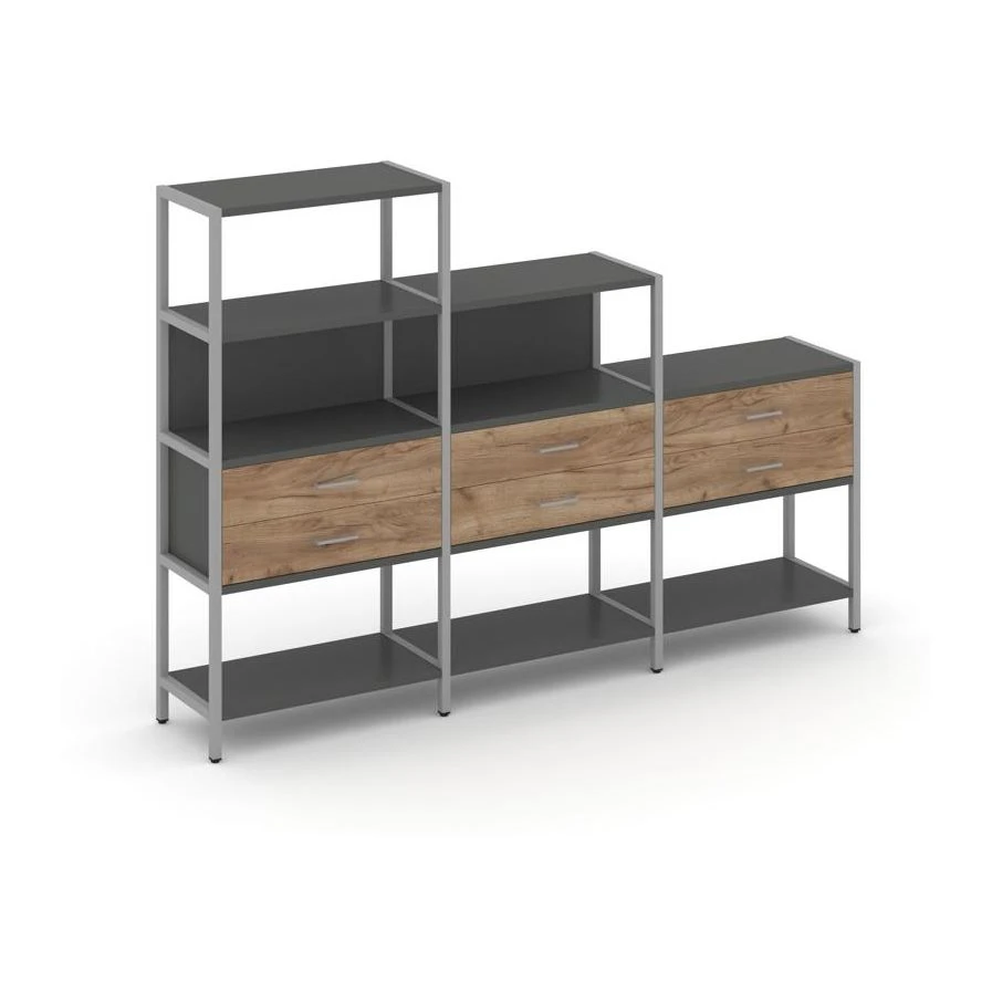 - Трехсекционный стеллаж четырех/трех/двухярусный с ящиками 2730х400х1613 Шелф Систем / Shelf System